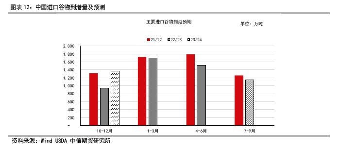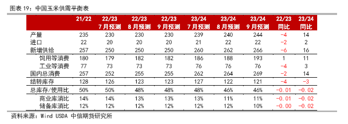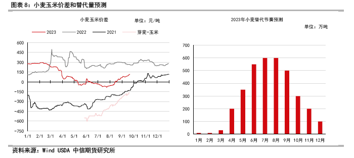 从小麦的年度供需格局看,2023/24总体产量下滑,优质小麦比例偏低,四季度开始面粉需求进入季节性旺季,小麦价格预计震荡偏强,月度饲用量减少,而到明年2季度预计体现供需偏紧的格局,陈麦结转库存有限,对新麦价格有支撑作用,如果无严重芽麦情况,预计饲用量将较今年显著下降。