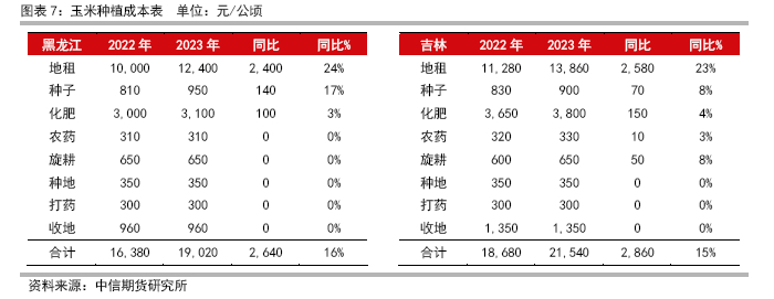 2023年4月23日到27日期间对黑龙江,吉林,辽宁内蒙部分地区的种粮户,种肥经销商,贸易商等327个样本进行了走访调研。2023年黑龙江吉林地区种植成本每公顷达到1.9-2.2万元,同比提升约16%,主要来自于地租上涨,上涨幅度约为2400-2600元/公顷,同比上涨约23%;种子化肥等成本也有一定增长。基于调研样本反馈的成本情况,预测2023年产的玉米集港成本约为2450-2650元/吨。
