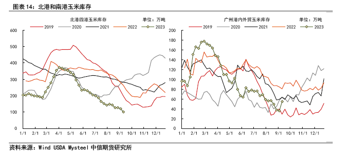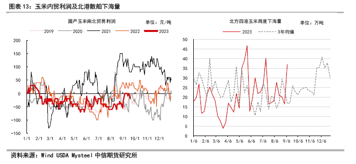 一二季度进口谷物到港量较大,南北贸易利润水平偏低。三季度饲用需求环比提升,南方地区由于三季度进口到港量有所下降,对于国产玉米贸易需求偏高,东北内地库存和港口库存逐渐消化降低。四季度新季玉米完成收获,供应逐渐增加,南北贸易量和下游库存预计出现季节性增长。