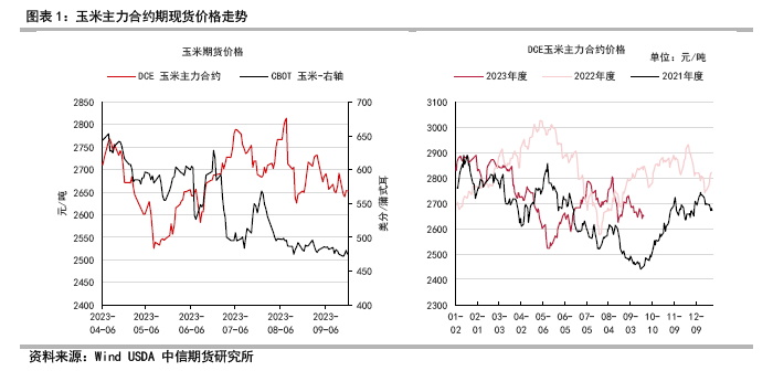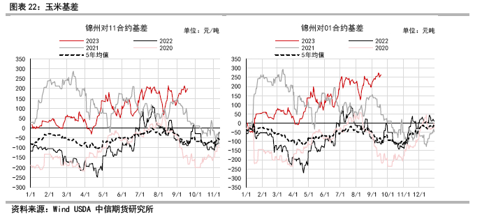 2022/23市场年度尽管替代压力较大,各市场主体维持低库存思路运营的格局中,玉米价格逐步反弹,年末库存去化到近几年偏低水平,8-9月份现货价格触及历史同期高点。C2307,C230合约不断走强与现货回归,一定程度上验证了玉米减产幅度,饲用需求整体好于预期,导致2022/23市场年度在谨慎悲观的预期中,最终收尾于偏紧的供需格局。