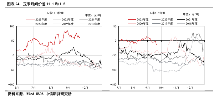3季度差走势回顾:玉米库存去化偏低,现货坚挺,7-9月差和9-11月差走势较强,近月贴近现货上涨回归,远期仍在供应增加的预期中表现相对弱势,最终以倒挂结构收尾,显著高于历史同期,对应玉米高基差的格局。