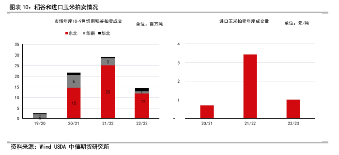 定向饲用稻谷拍卖,8月3日饲终于起拍,底价提高100元/吨。前两批拍卖局部溢价较高,对市场带来一定热度,后期拍卖成交比例维持在85%左右,溢价有所下滑。截至9月21日,饲用稻谷拍卖量近1430万吨,黑龙江省成交量占比约84%,预计9月28日再拍卖最后一次,成交量近1500万吨。