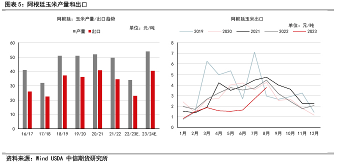 美国农业部对202022/23年度阿根廷玉米产量预测维持3400万吨,同比同比下降1550万吨;202023/24年度阿根廷玉米产量预计从拉尼娜气候的影响中恢复到5400万吨,同比增加2000万吨。2022/23出口预期2300万吨,同比下降1170万吨;2023/24出口预期4050万吨,同比增加1750万吨。