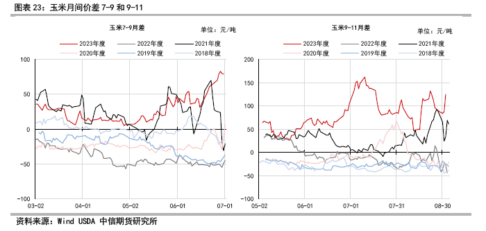2022/23市场年度在玉米减产,进口谷物增加,需求恢复缓慢的预期中展开,随着农民余粮售罄,市场商业供应达到顶峰时,小麦供应过剩的压力同时体现,陈麦和芽麦的替代冲击预期下,玉米价格在5月中触底,前后高低点落差近500点。尽管替代压力较大,市场预期并未显著改善,各参与主体维持低库存思路运营的策略,5月中玉米价格逐步反弹,库存去化到近几年偏低水平,8-9月份现货价格触及历史同期高点;7,9合约不断走强与现货回归,可能验证了玉米减产幅度叠加储备增储的影响,需求端,深加工需求疲弱,但是饲用需求整体好于预期,可以与生猪存栏,饲料工业协会的饲料产量数据大体匹配。2022/23市场年度在谨慎悲观的预期中,最终收尾于偏紧的供需格局,2023/24市场年度,供应端玉米产量市场预期增幅1200-2000万吨,进口预期随着巴西,美国玉米丰产,澳洲大麦双反政策取消,美国高粱产量修复等饲用谷物进口量预计同比显著增长,但是国产小麦的替代量预计同比显著下降。需求侧预期相对谨慎。年度供应端仍有一些不确定性,例如进口玉米增幅,保税区进口政策,额外配额的发放,进口玉米净流入储备的体量等,结合当下的预期,期末玉米仍难大幅累积库存。