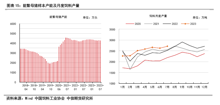 根据饲料协会公布的饲料月度产量看2023年1-7月总饲料产量达到1.76亿吨,同比增幅约7%,2022年10月到2023年7月周期看总饲料产量达到2.57亿吨,同比增幅7%。总饲料产量呈现显著增长趋势,和生猪,禽类产能增长趋势大体匹配。下半年节假日较多将迎来季节性肉蛋需求的旺季。同时从猪禽产能结构和消费季节性规律看四季度饲料消费预计处于年内高位。