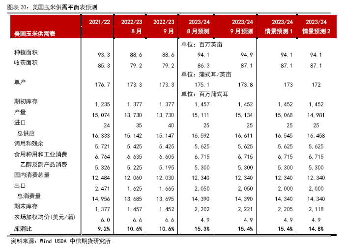 旧作方面,9月报告出口4230万吨,同比-2050万吨,国内消费3.06亿吨,同比-1150万吨;年末结转库存3687万吨,同比+190万吨。2022/23美国玉米平衡表的月度修正基本体现了出口需求不及预期的大体趋势,全球需求的低迷表现,也令市场对2023/24年出口同比增加978万吨的预期存疑。