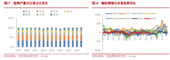 供给侧改革之后出现的另一个情况就是钢材区域供应格局发生了一定的变化,2017年之后,环保限产成为控制钢材供应增加的一个重要手段,而每年环保限产政策的重点区域基本集中在华北地区,所以我们看到2018年以后华北地区的粗钢产量占全国的比重呈现逐年下降的趋势。相反因电炉钢投产因素的影响,华东、华中和华南地区的粗钢产量占比则呈现逐年回升的趋势。