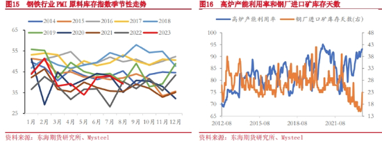 那么从2019年开始,钢厂对于原料基本采取了去库的策略,从图表15中可以看出,2019年之后尽管钢铁行业PMI原料库存仍有一些季节性波动,但总体上呈现逐年下移的趋势。图表16展示了高炉产能利用率和钢厂进口矿库存天数的关系,在2020年以前,钢厂进口矿库存天数基本是高炉产能利用率的领先指标,也就是说钢厂每次计划停复产之前都会提前进行原料的去库不和补库,而2020年之后,这一规律开始有所减弱,2021年9月之后,虽然钢厂的高炉产能利用率整体呈现回升趋势,但钢厂进口矿库存天数则持续下行,截止到2023年9月底已经创出了15天的历史新低。