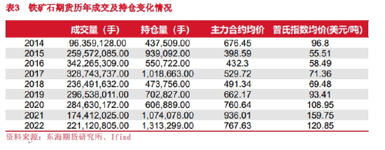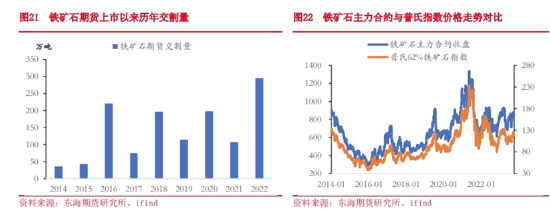 铁矿石期货自2013年上市至今已经满10年,现在已经是一个非常成熟的国际化品种。铁矿石期货上市以来运行平稳,成交量和持仓量均不断扩大,2022年全年成交量达到2.21亿手,按每手100吨计算为221亿吨,约为年度进口量的20倍左右。具有市场活跃度高、流动性强的特点。且根据我们的测算,铁矿石期货上市以来的走势和普氏指数的相关度达到97%。所以期货市场的套期保值和价格发现功能在铁矿石期货这个品种上得到了很好的发挥。