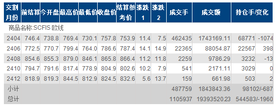 10月23日,集运指数(欧线)期货(EC)全线上涨。截至收盘,主力合约EC2404收于757.8点,涨幅1.53%,日内减仓1074手。