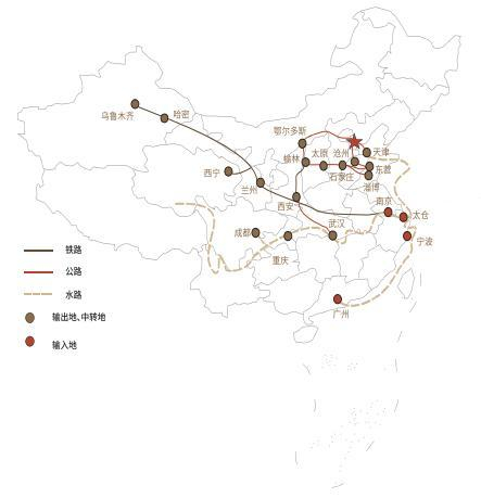 中国甲醇内贸流向图。我国的甲醇市场一般划分为华东、华南、华北、华中、东北、西北和西南等区域性市场。总体而言,华东地区作为我国甲醇的主流消费地和集散地,市场活跃程度高,价格具有较强的代表性。甲醇期货价格以华东甲醇现货价格为基准。