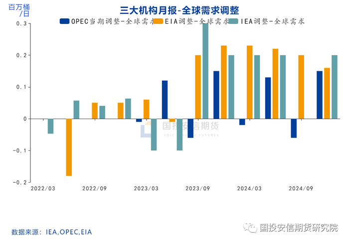 IEA、EIA、OPEC三大机构11月月报的调整偏小,主要体现在对今明两年的需求预期及非OPEC供应预期均进行上调,以及对巴以冲突影响有限但市场仍有缺口的现状再次确认。