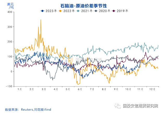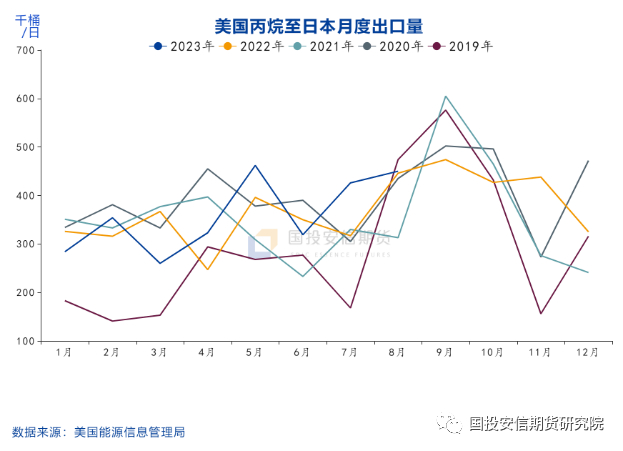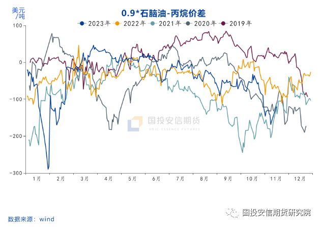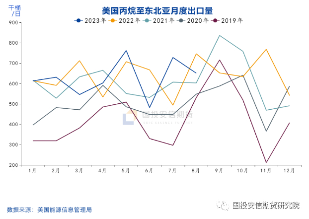 根据EIA公布的数据,美国1-8月丙烷月度出口累计值1216.4万桶/日,其中至东北亚为501.6万桶/日,占比41%;其中出口至日本为287.8万桶/日,占东北亚比重超过57%,可见日本在冬季到来之前大量进口LPG主要是取暖需求。因此每年的下半年随着气温的下降,LPG对石脑油的替代有明显的下降,也是石脑油价格季节性走强的主要驱动。