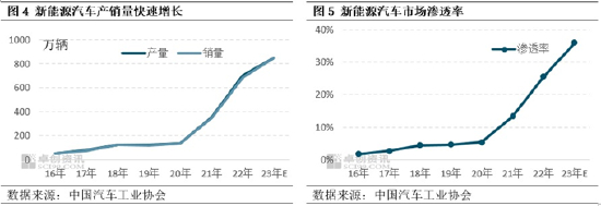近年来,新能源汽车产业在全球范围内快速发展,各国政府和企业也纷纷加大了投资力度,推动新能源汽车的研发和生产。中国新能源汽车产销量也在多年的沉淀积累后得到快速释放。截至2023年,中国新能源汽车产销量预计将超过850万辆,市场渗透率将达到36%;预计2024年新能源汽车产销量或将进一步提升至1300万辆,市场渗透率将扩大至47%的高位水平。