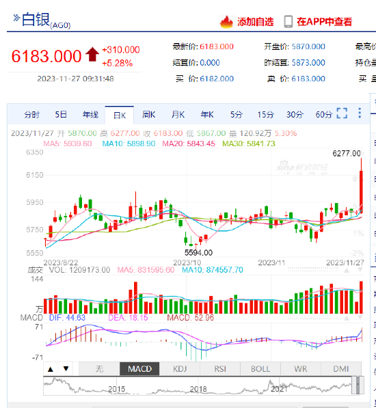 2023年11月27日,沪银期货主力合约开盘涨近2%,截至9:31已涨超5%,报价6183元/千克。