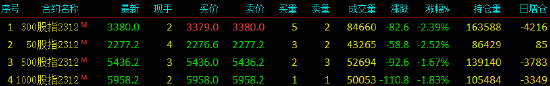 2023年12月5日,股指期货震荡下行,沪深300股指期货(IF)主力合约跌2.39%,上证50股指期货(IH)主力合约跌2.52%,中证500股指期货(IC)主力合约跌1.67%,中证1000股指期货(IM)主力合约跌1.83%。