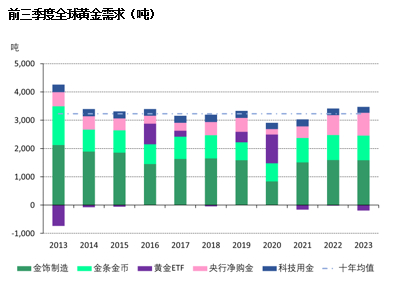 据世界黄金协会,2023年前10个月,全球央行净购金持续大幅上升,金饰制造需求保持稳定,整体金条金币需求同样稳固,全球黄金ETF持仓下降但中国黄金ETF持续出现净流入,金矿产量和回收金供应上升。
