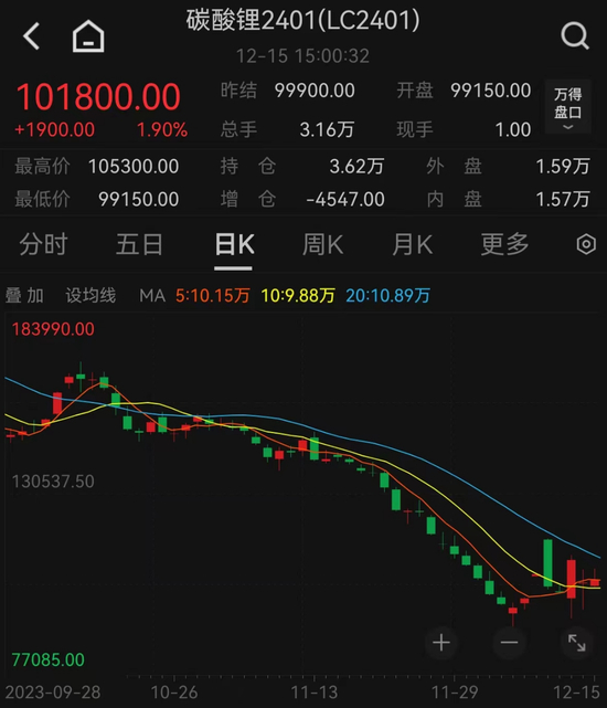 事实上,碳酸锂期货是今年7月上市的新品种,其价格呈现一路下跌趋势,从20万元以上跌到了9万元以下。12月以来,碳酸锂期货价格大幅波动,比如碳酸锂期货LC2401合约先是在12月4日、5日接连跌停,但在12月7日、8日接连两天涨停。受此影响,碳酸锂期权出现了罕见的“末日轮”行情,单日暴涨数百倍,引发市场关注。