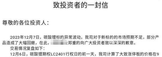 本周,一家小型私募基金管理人在《致投资者的一封信》中表示,今年12月7日,碳酸锂标的异常波动,公司对于新标的的市场预期不足,部分产品造成了大幅回撤。为了表达歉意,公司决定此次涉及到的相关产品,从回撤修复到2023年12月6日的净值期间,不收取任何业绩报酬。