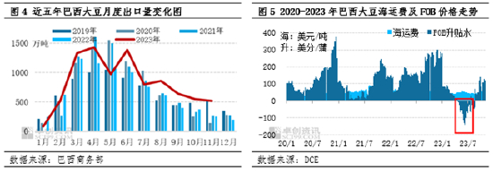 随着巴西大豆供应量的不断增加,市场供应窗口期也不断延长,打破了南半球、北半球各半年的历史供应格局。根据巴西商务部数据统计显示,2023年1-11月巴西累计出口大豆9092.97万吨,同比增长17.73%。每年的3-9月是巴西大豆的出口旺季,2023年巴西出口窗口期明显延长,截至11月,巴西仍有超500万吨的出口量,去年同期出口量仅为252万吨。受出口压力影响,年内巴西大豆FOB升贴水价格跌破历史新低。除此之外,供应量增加带来的仓储压力、装船能力、物流运输等问题,也成为2023年影响豆粕价格的阶段性驱动因素。