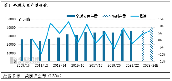 近年来全球大豆产量呈现震荡增长态势,根据美国农业部数据统计显示,近十年全球大豆产量平均增长率为3.55%,近五年全球大豆产量平均增长率为1.96%。整体看,全球大豆的供应增速呈现放缓趋势,根据12月USDA最新公布的数据显示,2022/23年全球大豆产量预估为3.74亿吨,2023/24年度全球大豆产量预计再创新高,数值为4.00亿吨。