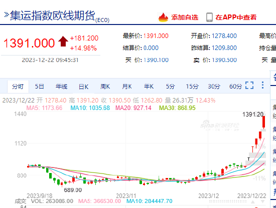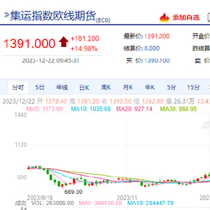 12月22日,集运指数(欧线)主力合约触及涨停,涨幅14.99%,报1391.2点,为连续五个交易日触及涨停,本月迄今涨近70%。