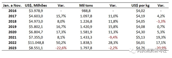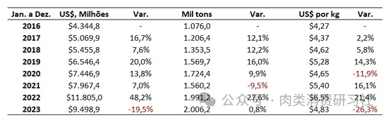 根据COMEX的数据,下表显示了2016年-2023年巴西牛肉出口累计数据。