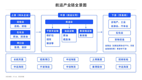 从产业链上来看,其上游是造(修)船、港口码头等基础供应产业,下游服务钢铁、房地产等国民经济基础行业。产业链的传导作用自下而上,即下游的运输需求会拉动海运的兴衰。此外,随着近年来企业越来越多地采用远期运费协议(FFA)等衍生工具来进行套期保值,其与金融业的联系也不断加深。