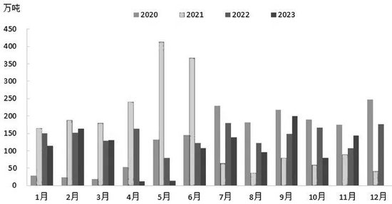 国内炼厂沥青生产原料以重质原油为主,沥青产能占比较大的地方炼厂以稀释沥青为主要原料,同时会与其他少量轻质原油进行掺炼。稀释沥青主要产自委内瑞拉,其作为国内沥青生产的主要原料,沥青出率较高达到60%,尤其是地方炼厂普遍使用稀释沥青来加工沥青,但受地缘局势动荡以及政策变化影响,近几年稀释沥青进口供给并不稳定。2023年年初,委内瑞拉原油发往中国的船货明显下降,此后海关29号文又令稀释沥青通关受阻。2023年1—11月,国内稀释沥青进口量为1200万吨,同比下降21%,月均进口量为109万吨,而2022年国内稀释沥青月均进口量为141万吨。由于稀释沥青供给不稳定以及地炼原油进口配额有限,2023年国内地炼增加了燃料油进口,以补充沥青原料供给紧缺。2023年1—11月,山东及天津港口的炼厂加工方向用燃料油累计到货量接近1100万吨,而2022年同期仅有113万吨左右。