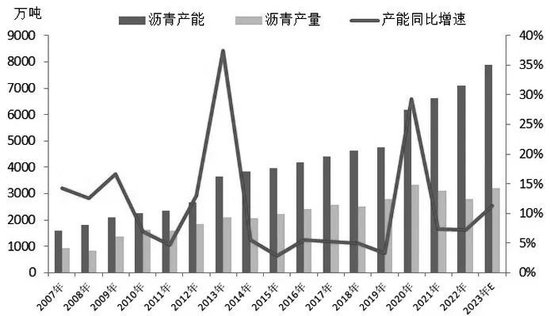 沥青道路需求与国家公路建设量及建设周期息息相关,从长周期来看,沥青道路需求与国家公路建设5年规划有关,而从短周期来看,与公路建设投资进度及阶段性项目开工有直接关系。“十四五”期间公路建设总里程预计将达到550万公里,预计较“十三五”期间增长30.2万公里,年均增幅为6万公里,增幅为过去20年来新低。2023年是“十四五”的第3年,公路项目进入集中施工期,但年内资金端持续偏紧,公路项目开工有限,沥青用量也明显受限。2023年1—11月,国内沥青表观消费量达到3193.8万吨,同比增长14.4%。