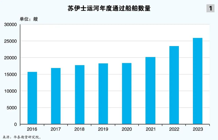 红海航道危机之前,经过苏伊士运河的船舶数量逐年增加。根据华泰期货研究院提供的数据,2023年经过苏伊士运河的船舶数量为25887艘,货物总量超21.7亿DWT,刷新历史纪录(见图1)。从船舶数量层面,2023年干散货船经过苏伊士运河数量最多,达7395艘;油轮通过量为6092艘;集装箱船通过量为5847艘;液化天然气(LNG)船通过量为817艘。从载重吨层面,2023年通过苏伊士运河的集装箱船舶载货量最高,达7.13亿DWT;油轮载货量达6.94亿DWT,干散货船舶载货量约5.64亿DWT。