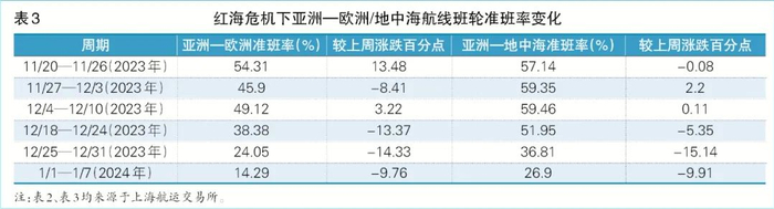 持续绕航对多条主干航线的准班率影响已显现。根据上海航运交易所提供的数据,2023年12月18日—2024年1月7日,受实际运输货量增加、红海海域不稳定等因素影响,亚洲—欧洲、亚洲—地中海航线准班率连续下降(见表3)。由于红海局势持续紧张,准班率影响已外溢至美东航线,准班率持续三周下降。