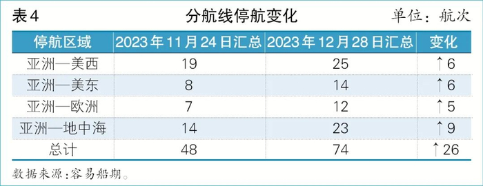 红海的风云诡谲,加剧几大主干航线的停航现象。根据容易船期提供的数据,对比2023年11月和12月,停航数增加26条。其中亚洲—地中海临期停航情况最多,新增9次;亚洲—欧洲新增5次(见表4)。