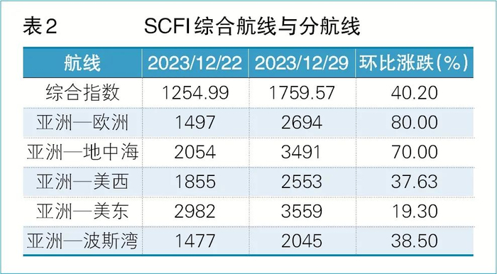 根据惠誉与华泰期货研究院的分析数据,绕航使全球集装箱运输有效运力减少10%~15%。有效运力损失叠加春节前出货小旺季的双向支撑,集装箱船运价持续上涨。根据上海航运交易所发布的数据,随着红海航道危机持续发酵,除了欧洲与地中海航线运价跳涨,影响已外溢至美西、美东和波斯湾航线,环比涨幅在19%以上(见表2)。