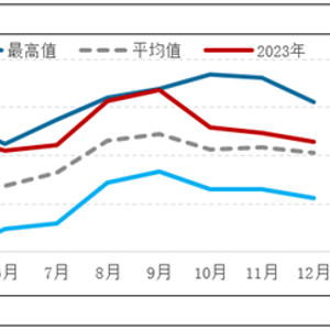 2023年12月份主产区鸡蛋月均价4.29元/斤,环比跌幅3.81%,同比跌幅15.88%,月均价已经连续3个月呈下滑趋势,且同比跌幅较为明显。从近10年蛋价走势图中可以看出,12月月均价虽高于近10年的平均水平,但从全年来看,蛋价处于2023年的偏低位置,月均价仅略高于6-7月份的传统淡季。鸡蛋价格持续走低,主要受鸡蛋供应充足和需求不佳双重影响。