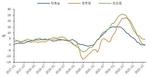 市场中另一个更加积极的信号就是库存。进入2022年后,美国商品的社会库存在批发商和零售商在对需求的过分乐观以及“牛鞭效应”的影响下冲击高位,然而超预期的疲软需求无力消耗大量累积的库存,这在很大程度上抑制了进口需求。然而,截至今日我们可以看到社会库存数据已经出现了积极的信号:从图2-2可以看到美国的库存同比变化已经回落至疫情之前水平,而制造业和批发商的表现甚至低于疫情之前,这说明美国各部门的积极去库已经取得了可观的成效。如此的去库节奏若一直延续至今年四季度将加快补库周期的来临,盘桓一年的库存压力被大大疏解,进口需求将得到一定程度的提振。