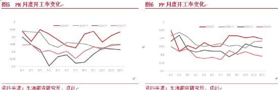 PP下游塑编行业和水泥、化肥产量息息相关。据国际统计局数据显示,23年1-12月水泥产量20.2亿吨,同比-0.7%,而不同种类的化肥产量数据也并不乐观,7月之前产量明显低于往年,8月之后虽有增长,但累计同比几乎持平。受此影响,塑编开工下滑。塑编近几年开工总体在40%-70%之间。今年开工出继续下滑,年均开工环比大约下跌3%左右。