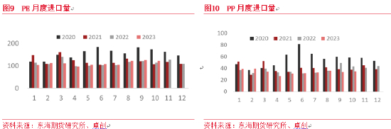Ø 产量低速增加:由于去年疫情影响下产量基数较低,虽然产能利用率下降但今年聚烯烃产量增速较高。据卓创资讯估算, 2023年1-12月PP累计产量在3225.13万吨,较去年同期增长7.01%。PE累积产量2735.24万吨,较去年同期增加12.18%。