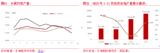 终端需求低迷是聚烯烃下游开工降低的主要原因。国家统计局发布2023年1-12月份全国房地产市场恢复不及预期,房屋新开工面积95376万平方米,同比下降20.4%;截至2023年11月,全国塑料制品行业产量6658.8万吨,同比增长0.6%。,等工业品相关的终端数据不佳直接影响聚烯烃下游需求。