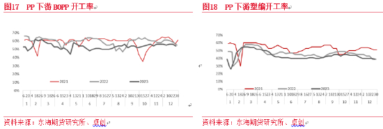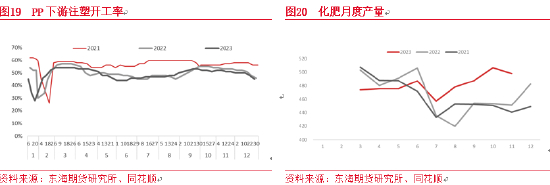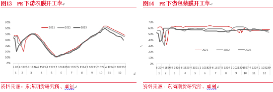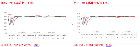 2023年聚烯烃下游需求受经济影响整体不及去年,聚烯烃下游(除农膜外)开工出现比较明显的同步变化,2月前后是全年开工的高点,随后在订单和利润负反馈作用下,开工率连续数月下滑,到5-7月附近达年内低点。7-8月下游出现明显改善,促进开工提升,“金九银十”需求不及预期,低于往年。四季度逐渐进入淡季,需求进一步走弱。