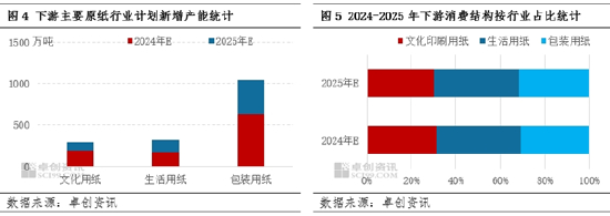 据卓创资讯监测样本数据显示,未来新增产能主要集中在包装用纸方面,因此预计未来包装用纸在下游需求结构中占比或从2024年的30.76%增加至2025年的31.80%;生活用纸为刚性需求,但生活用纸差异化产能持续释放及其他原纸占比增加的情况下,其在下游需求结构中占比或从2024年的37.46%窄幅增加至2025年的38.20%;文化印刷用纸后期的新增产能主要集中在双胶纸方面,而长期以来的电子媒体的冲击、双减政策带来的短期利空因素、文化印刷用纸自身产能过剩因素影响,文化印刷用纸在下游需求结构中占比或从2024年的31.48%降低至2025年的30.00%。