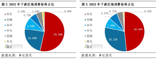 造纸行业一般分布在沿海地带,2023年中国纸浆整体消费区域占比中,除了东北地区、西北地区之外的其他地区占纸浆消费量的98.75%,较去年同期提升0.69个百分点,与原纸新产能持续在华东、华南地区释放有关。其中华东地区、华南地区分别占48.40%、30.22%,分别较去年下降5.14个百分点、上升6.62个百分点。