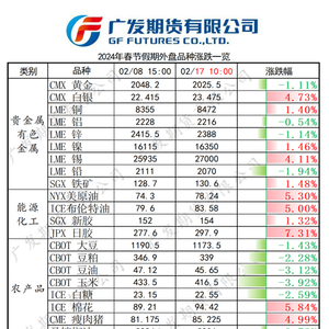 ▶明天国内期货市场即将开市。广发期货发展研究中心团队对春节期间行情涨跌情况做了汇总点评。让我们一起为明天的期货市场开盘做好准备吧!