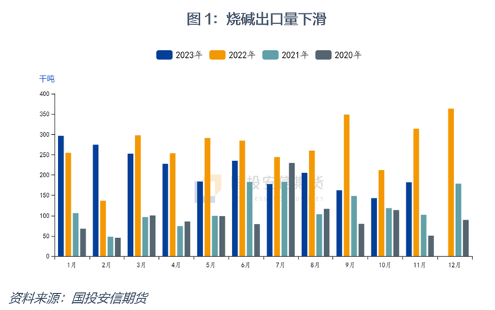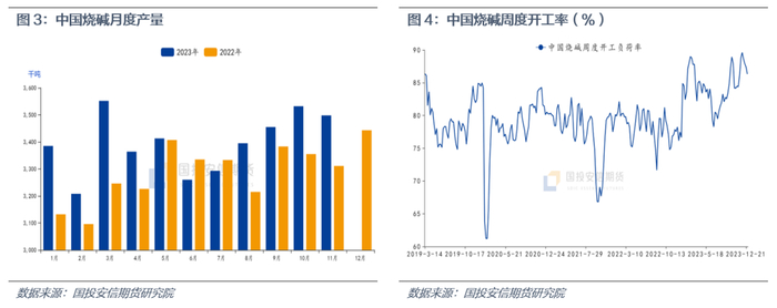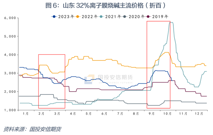 从烧碱开工率和氯碱企业毛利的数据来看,两者之间呈现明显的同向波动趋势,随着盈利能力的提升,烧碱开工率会随着提升,而随着盈利能力的下滑,烧碱开工率也会随之下滑。但从年度对比来看,2023年氯碱企业整体盈利能力较差,但烧碱的开工率确整体提升。我们都知道PVC这两年因为房地产的拖累,消费需求疲软,亏损情况较为突出。氯碱企业的盈利来源主要来自于烧碱。因此,尽管整体盈利水平下滑,但烧碱开工率依旧再提升。2024年对于房地产复苏仍然面临诸多困境,但从政策层面给与支持的力度较大,下半年地产复苏仍然可以有所期待,另外,PVC价格已经在底部区域徘徊日久,只要成本端没有明显提升,仅从PVC价格来看,很难有下行空间。下半年如果PVC能够走出低位区域,随着盈利的提升,对于烧碱来说,可以减轻一些盈利的压力,对于烧碱的开工和价格会产生一定影响,这是需要关注的。