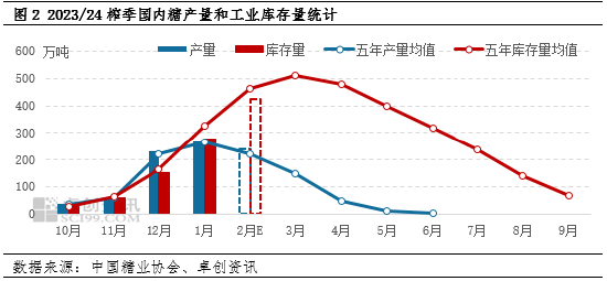按照国内白糖生产的季节性规律,一般每年12月到次年2月属于生产高峰期,该时间段的糖产量占到总产量的70%。虽然2月广西和广东分别有个别糖厂收榨,但南方整体仍然处于生产高峰期。按照季节性生产规律以及本榨季增产预期,卓创资讯预计2月全国糖产量240万吨,环比减少27.25万吨,但较五年产量均值水平增加21.14万吨。随着糖厂生产工作的进行,国内白糖库存量也处于上升阶段,一般每年3月达到全年库存峰值。卓创资讯预计截至2月底,国内糖厂工业库存量425万吨,环比增加149.95万吨。