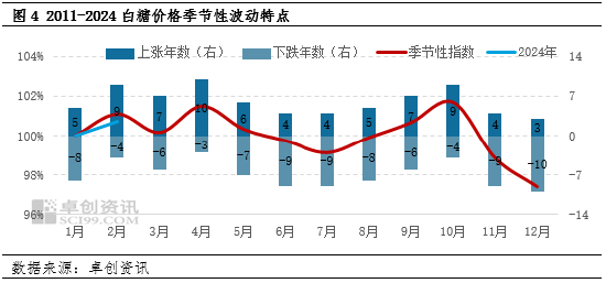根据2011-2023年白糖价格季节性波动特点,3月价格涨跌概率均有,但综合来看波动空间有所收窄。结合2024年3月国内白糖市场情况分析,3月主产区广西糖厂陆续收榨,国内生产高峰期将结束,但库存累积至全年峰值状态,而且1-2月进口量预期同比增长,进口原糖到货后加工糖厂或陆续开机生产,市场供应端维持宽松状态;需求端,年后白糖市场处于传统需求淡季,虽然中下游库存偏低的情况下,存在一定补仓需求,但市场整体消耗量处于相对低位。另外国际市场方面,亚洲主产国生产季尚未结束,且4月份巴西将开始新榨季,国际糖市贸易流相对宽松,糖价上涨动力不足。