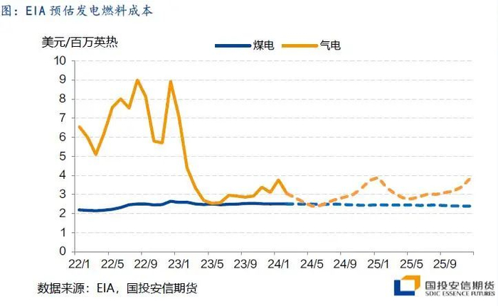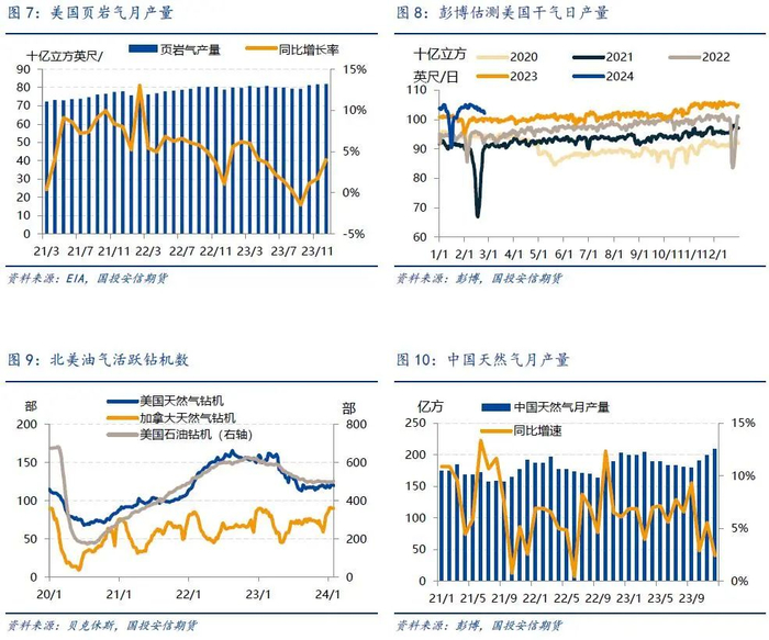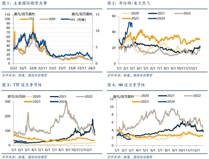 在2月初美国总统拜登宣布暂停新LNG出口项目的审批,由于近两年已完成FID在建的美国LNG项目多达518亿方/年,届时会使得美国LNG出口产能增长43.3%,这些项目均不会受暂停审批的影响,因此这一举措对于短期市场影响较为有限,主要反映了政府抑制气价和保障国内供应的态度,考虑到2024美国大选的影响,美气价格年内上行空间或更为有限。即期来看,freeport临时检修带来1月出口少量下滑,寒潮影响结束后,上周美国因去库放慢而库存再度回升至同比偏高水平,月中时HH价格已逼近1.5美元/MMbtu的极低价位,持续亏损压力下美国生产厂商在2月初生产恢复正常后开始主动减产,2月产量或只有103.7bcf/d,较23年四季度高位水平明显下滑,EIA最新展望中继续下调预期,认为24年全年内产量或低于23年高位。由于美国需求中,电力部门是弹性较大的领域,而相较欧洲市场,美国夏季高温使得其需求会出现峰值,我们看到在2美元/MMbtu价格以下后,供给环节已通过减产做出反馈,而气电竞争力也开始强于煤电,需求端有望得到持续改善,因此基调宽松的北美市场或在进入二季度后不断震荡筑底,通过将库存压制到较同期偏低后,价格有望再度回到上升区间,并为国际LNG市场提供成本支撑。