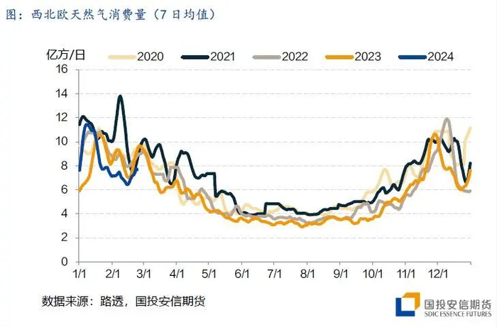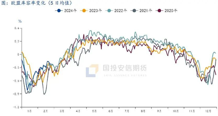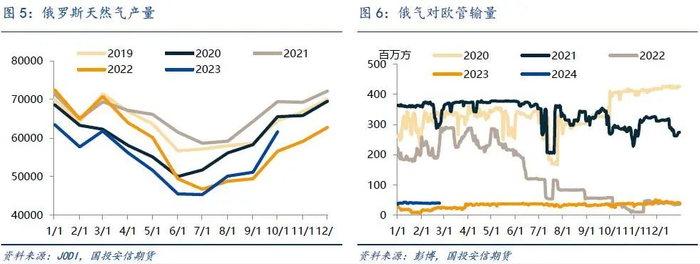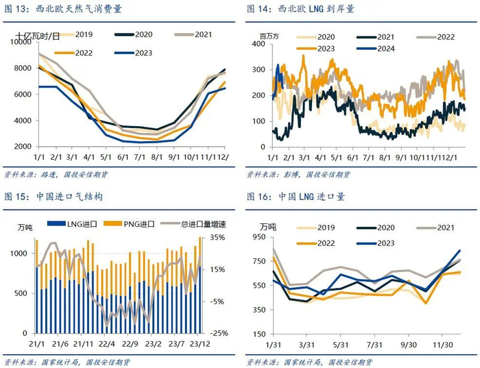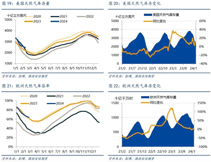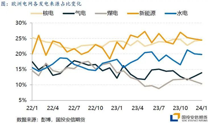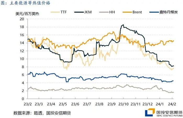 在此前的长期天气预报中,预计1-2月欧美市场难以出现23年的严重暖冬。目前来看欧洲在2月以后开始有较明显降温,但非城燃需求仍保持疲软,使得总消费量在2月中旬后才有所环比回升。2月欧元区综合PMI报得48.9,虽仍处收缩,但环比继续改善。另一方面电力领域1月欧洲电网发电量同比上升5.69%,结构上我们看到新能源和水电占比未能继续走高,而低气价开始产生对煤电的部分替代。因此尽管后续随取暖季结束,消费基数降低,但欧洲非城燃消费有望出现改善迹象,消费的同比降幅或有望收缩,进入区间低位的气价和欧洲宏观经济恢复对基本面会带来一定边际改善。