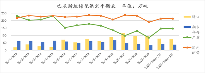 图表6:巴基斯坦棉花供需平衡表 单位:万吨