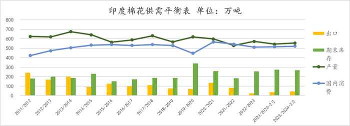 图表5:印度棉花供需平衡表 单位:万吨